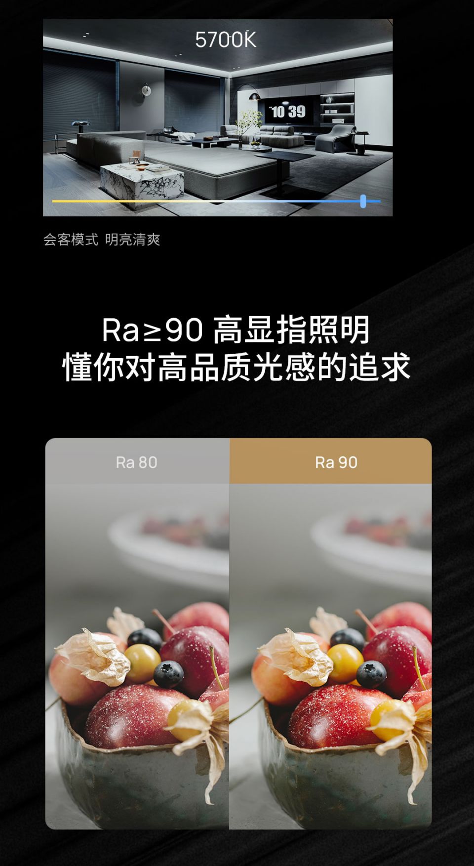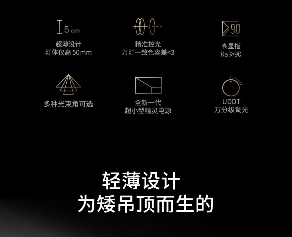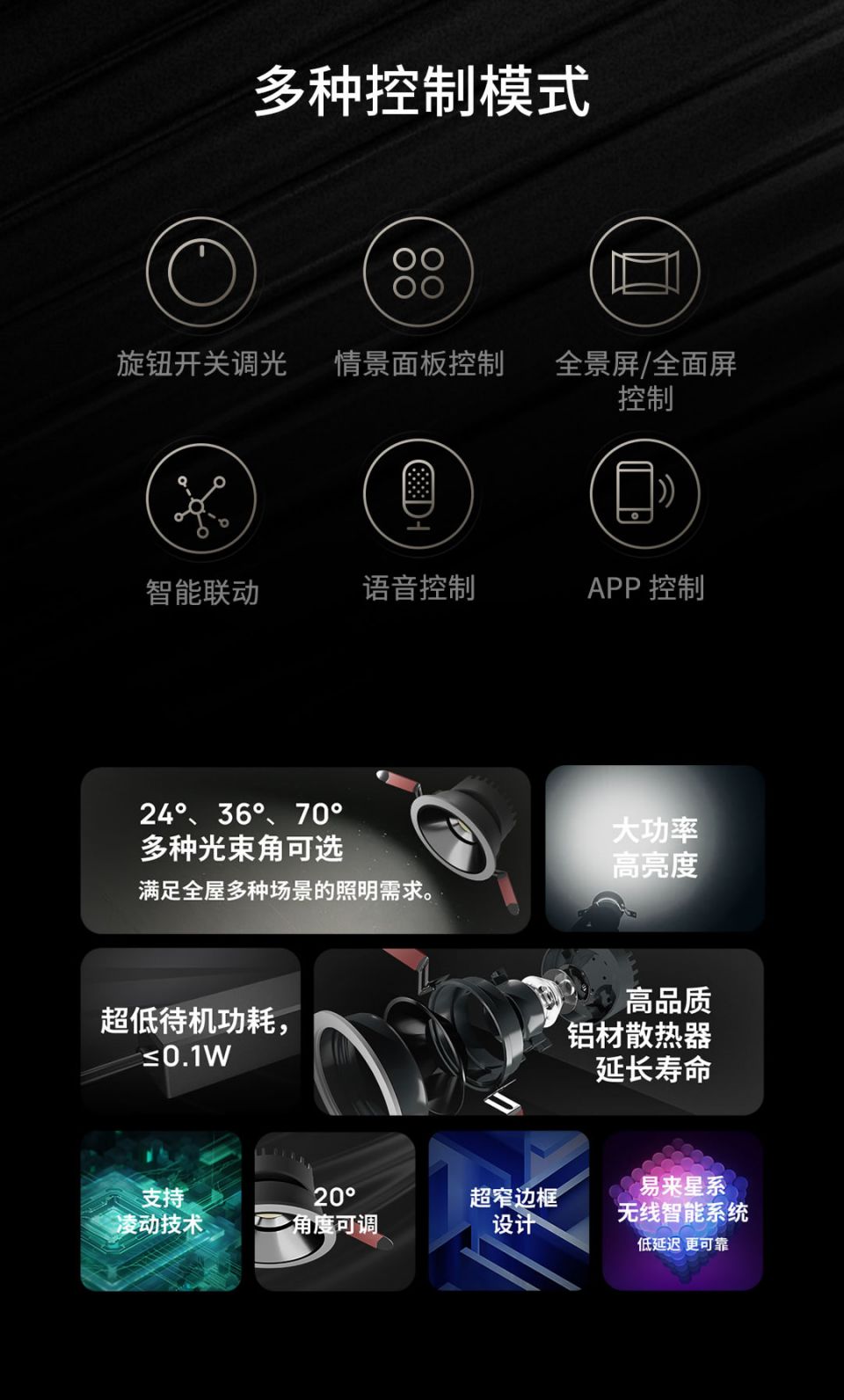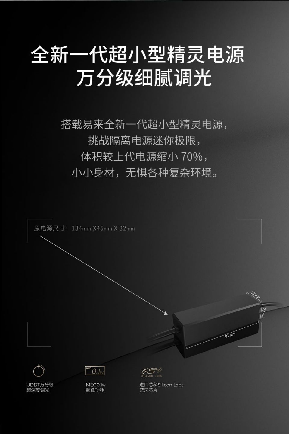 万分级深度调光,支持凌动技术,射灯UGR小于9,高度50mm,产品尺寸:85*50mm,功率:10W,色温:2700-5700K,显指:Ra≥90,光通量:520lm,光束角24度,调光深度:万分,开孔尺寸:75mm,,待机功效0.1W,电源尺寸:91.1*26.8*23,进口科芯Silicon Labs蓝牙芯片