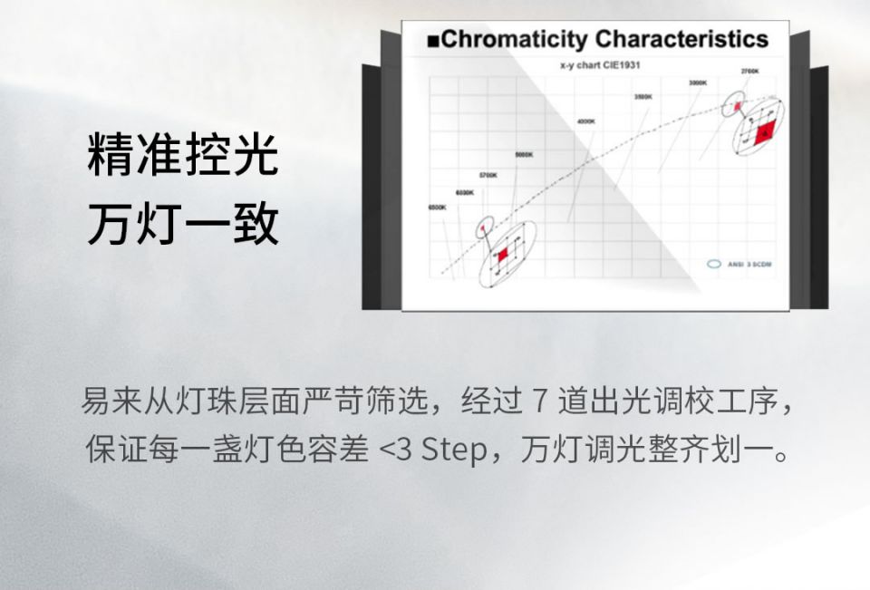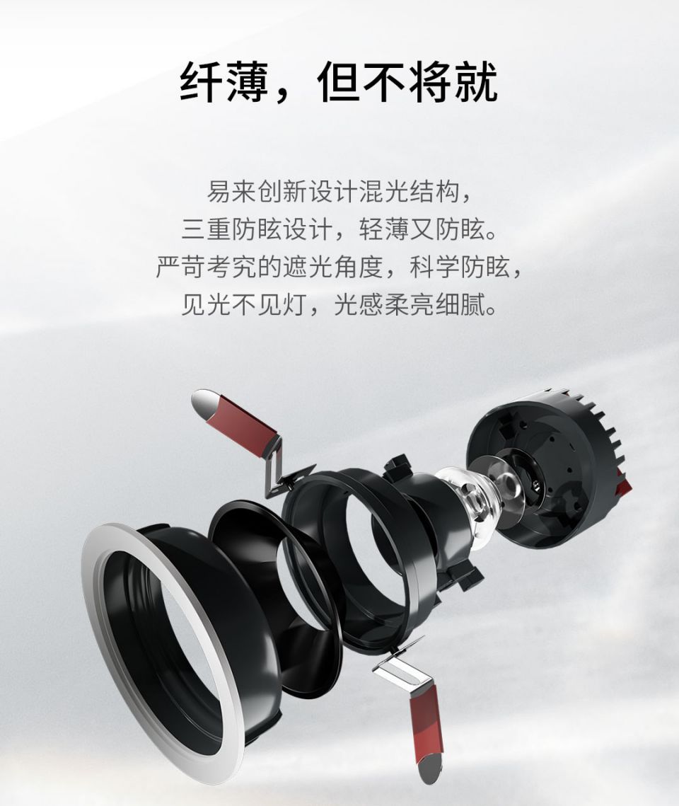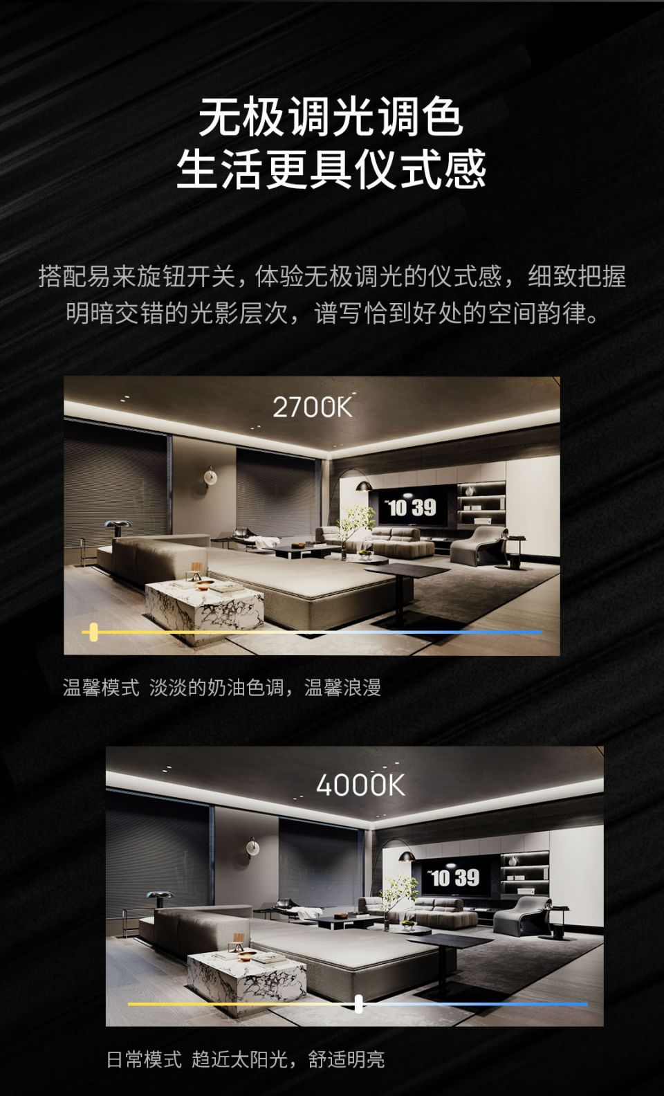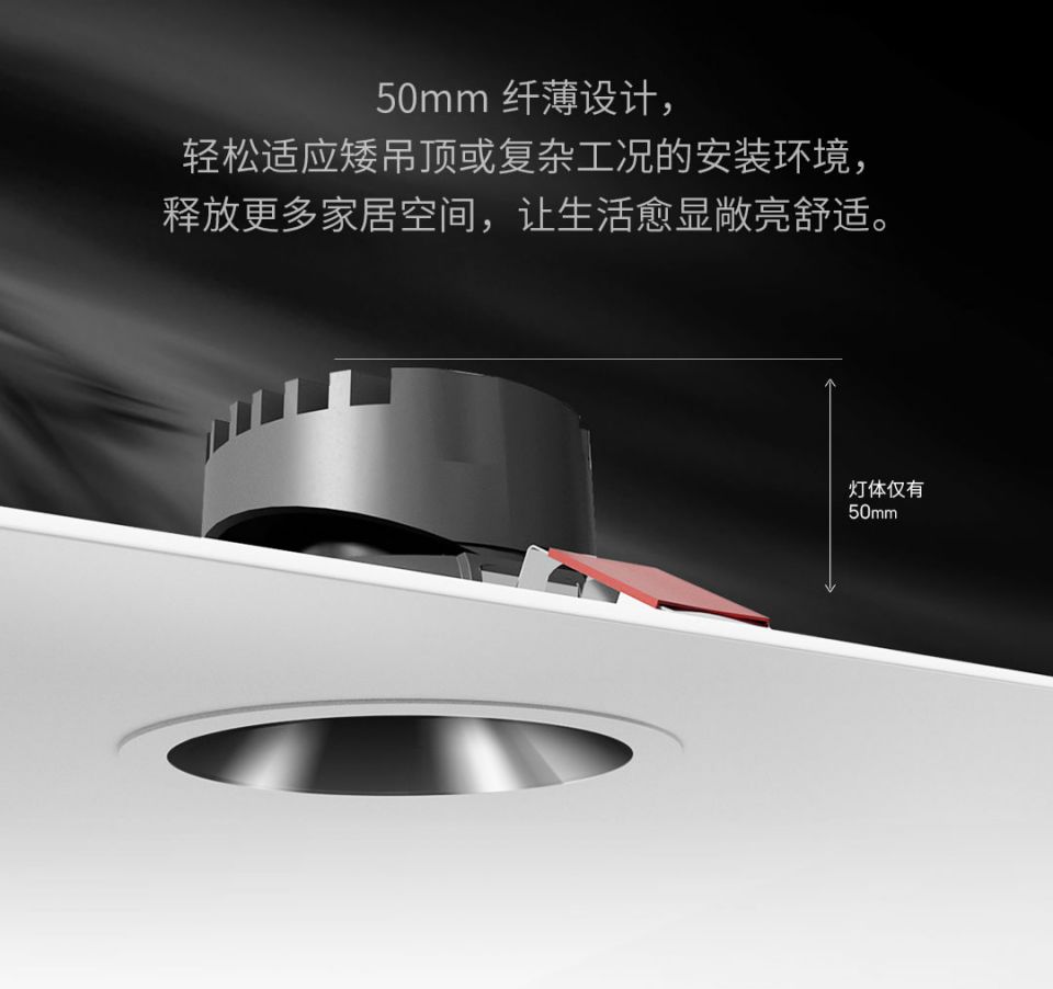 万分级深度调光,支持凌动技术,射灯UGR小于9,高度50mm,产品尺寸:85*50mm,功率:10W,色温:2700-5700K,显指:Ra≥90,光通量:520lm,光束角24度,调光深度:万分,开孔尺寸:75mm,,待机功效0.1W,电源尺寸:91.1*26.8*23,进口科芯Silicon Labs蓝牙芯片