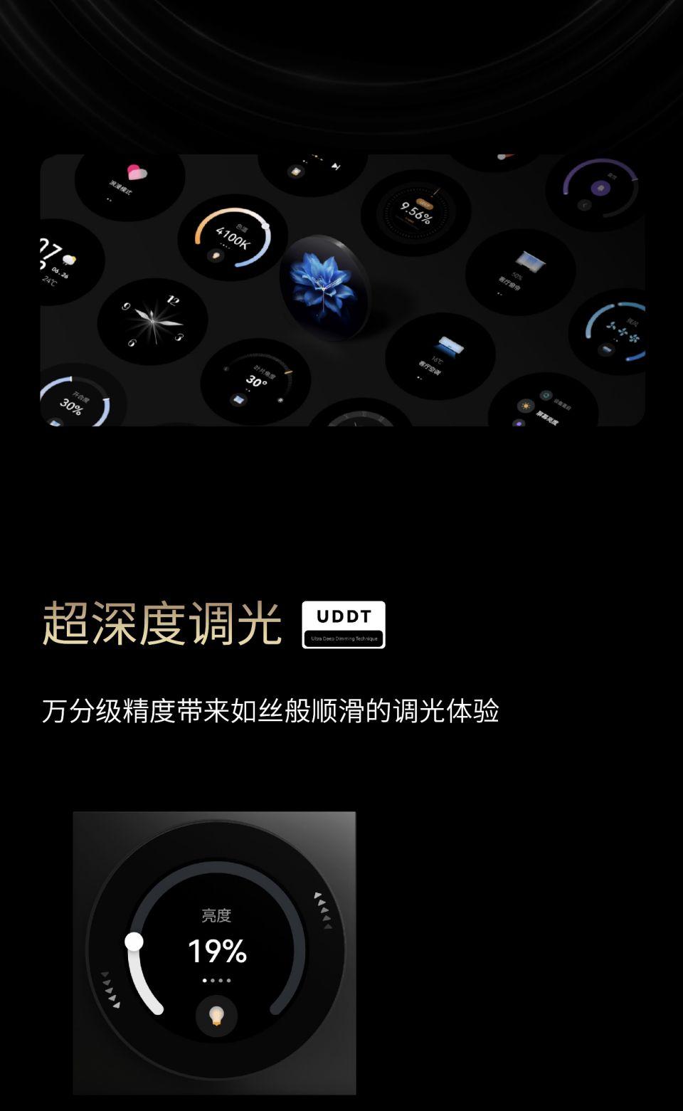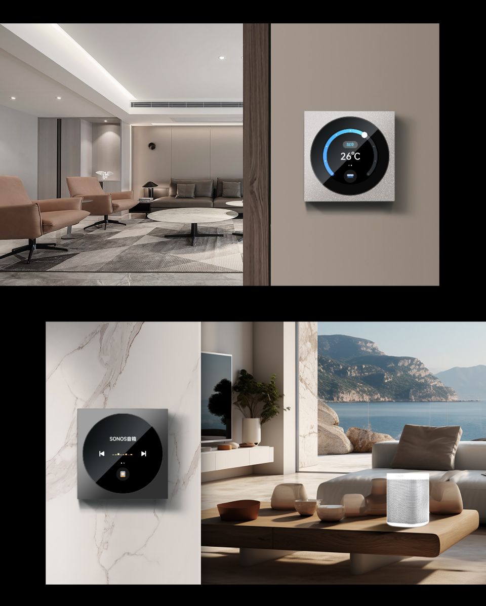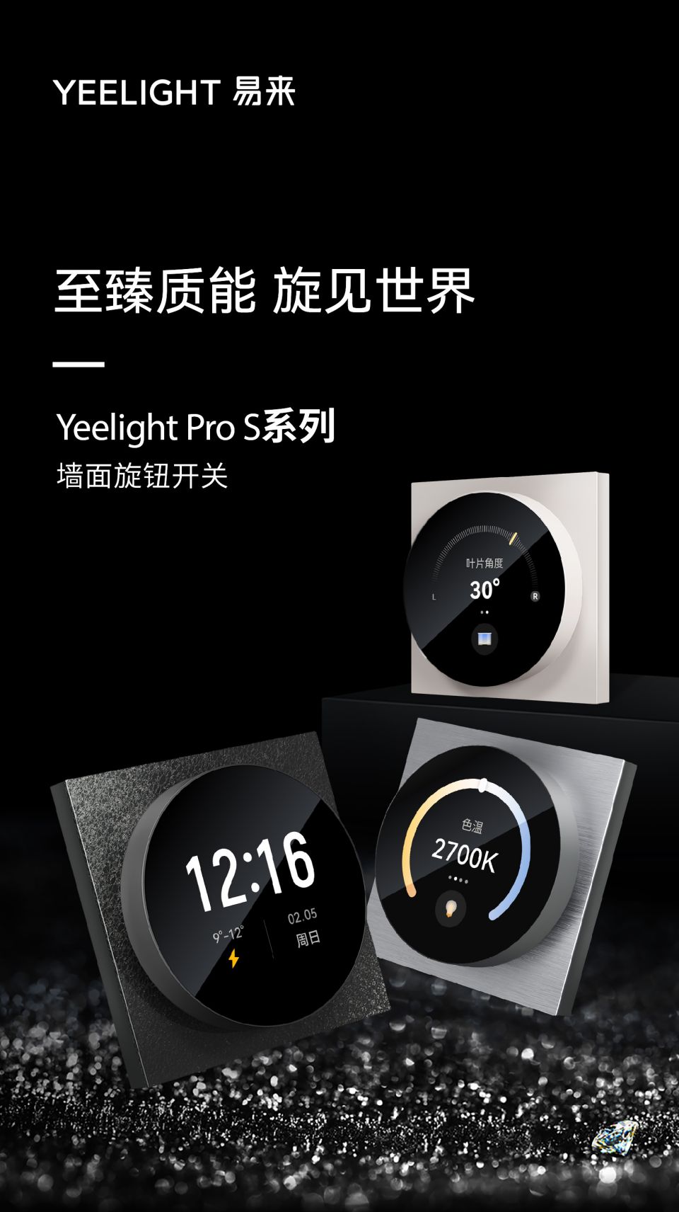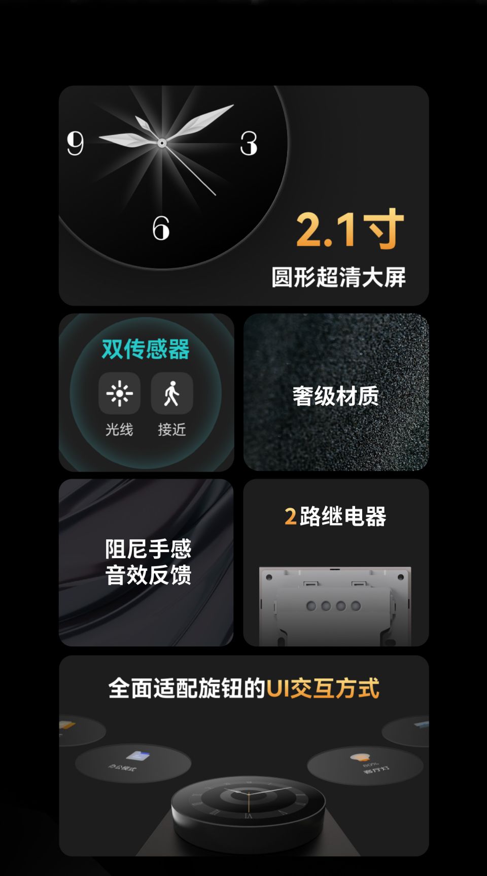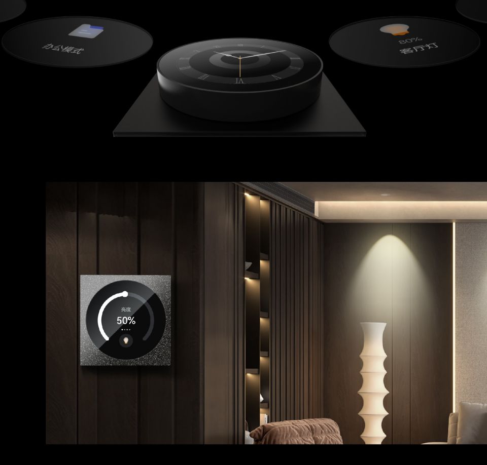 易来Pro S系列,2.1寸原屏,轴承手感旋钮,2路继电器,2种交互形式:触摸,旋钮,光线 接近双传感器,三种面板可选:微晶石面板,肤感玻璃面板,金属玻璃面板