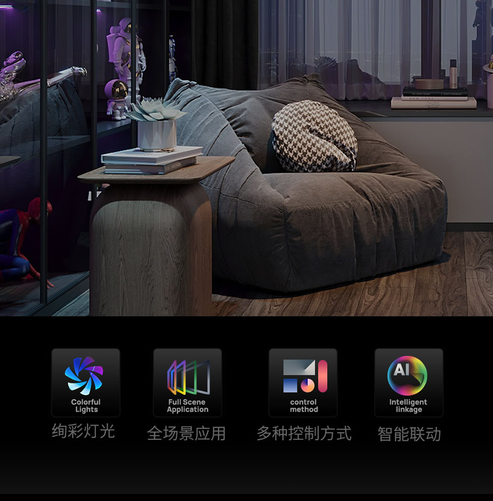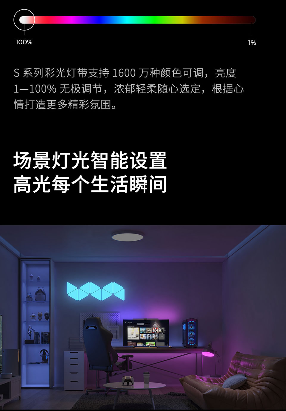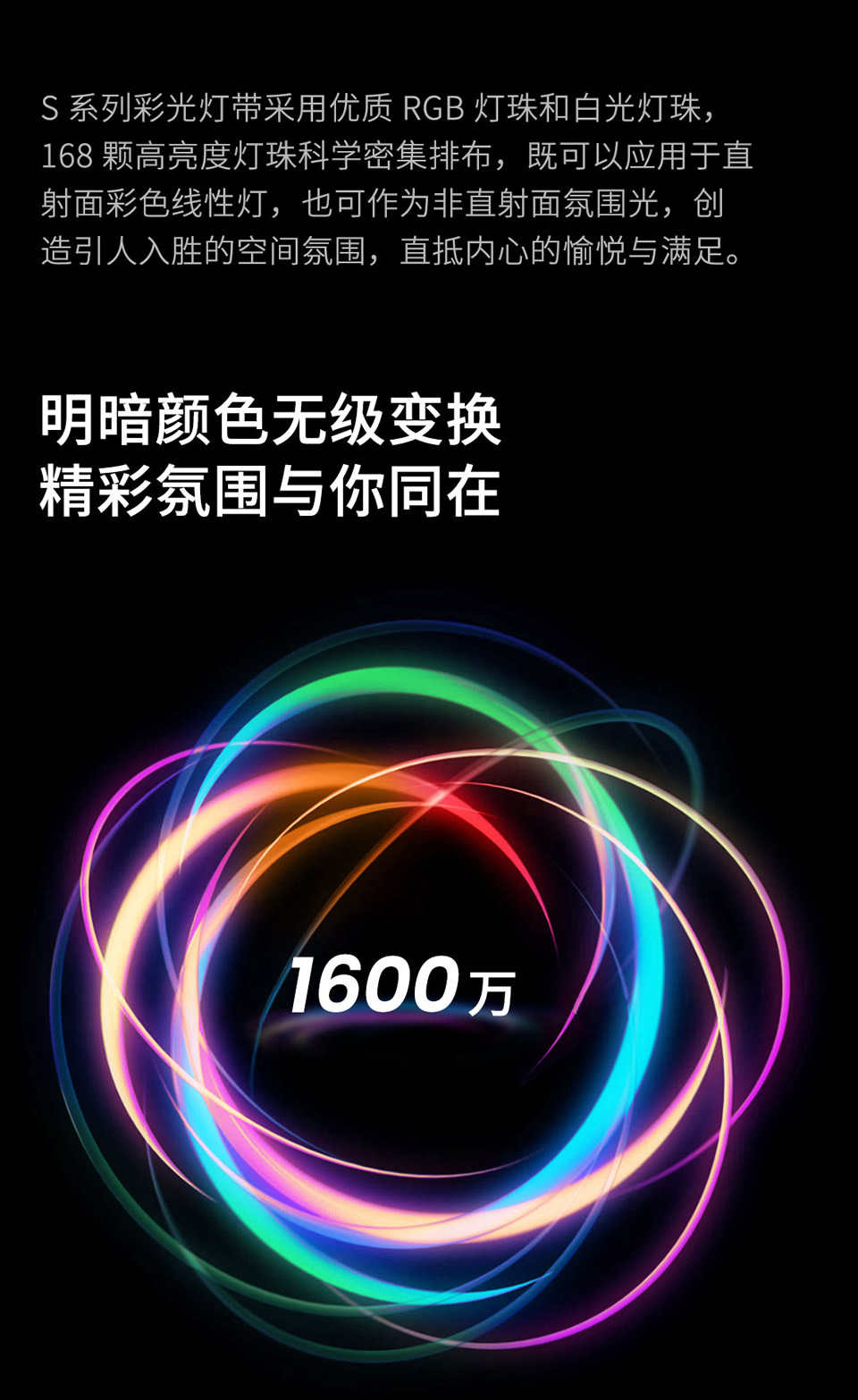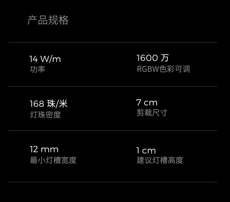 万分之一超深度调光,高品质照明,功率:14W/M,色温:2700-6500K,显指:Ra≥90,灯珠数量:168颗/M,灯带宽度:12mm,建议最小灯槽宽度12mm,建议灯槽高度15mm。