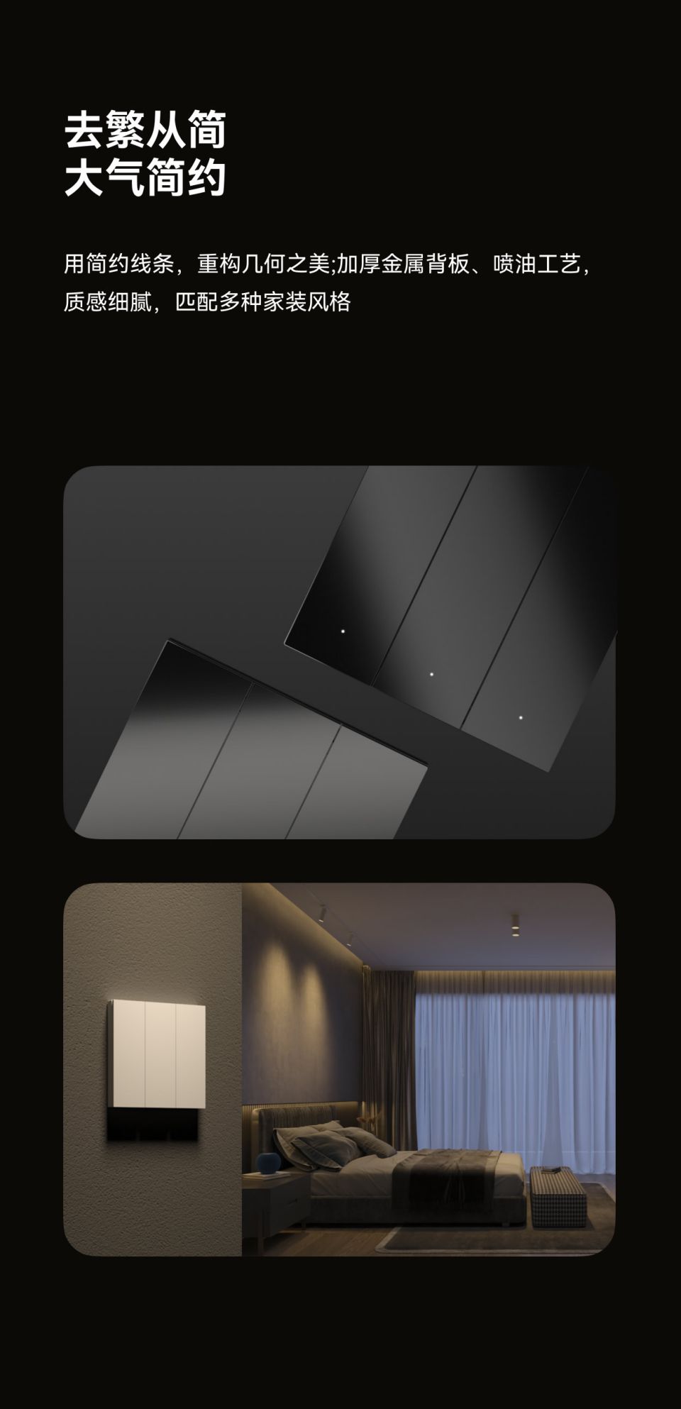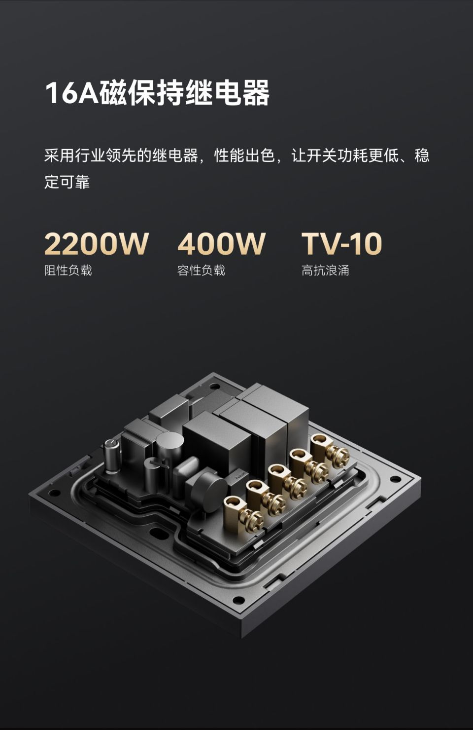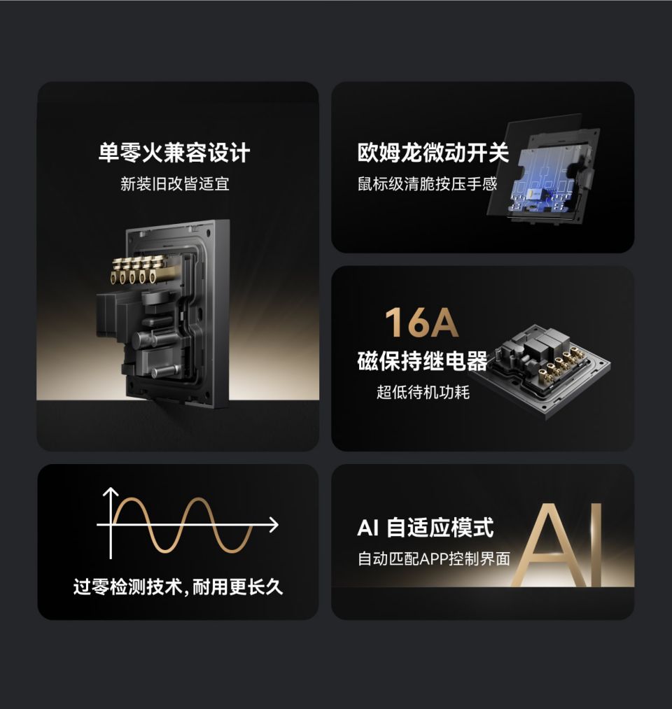极致简约设计,鼠标极清脆按压手感,继电器/情景模式切换,家族化墙面交互矩阵,供电:零火,每路负载:≤400W,面板材质;PC 手感漆,按键手感:鼠标级微动