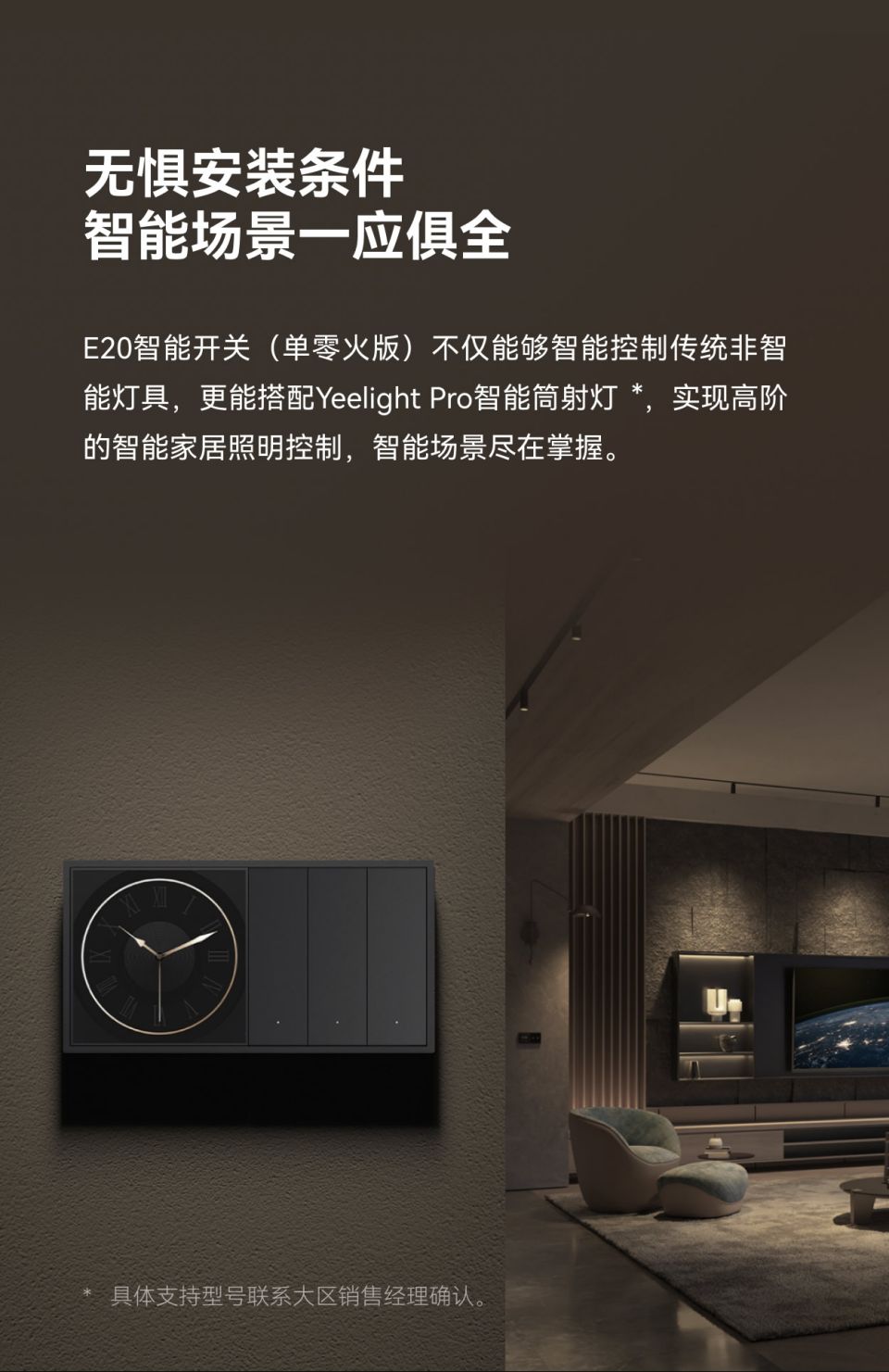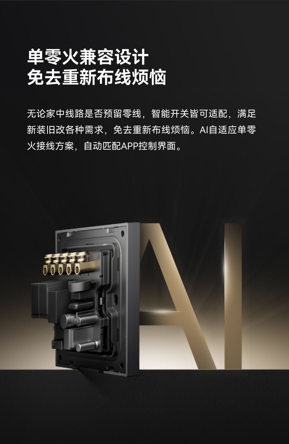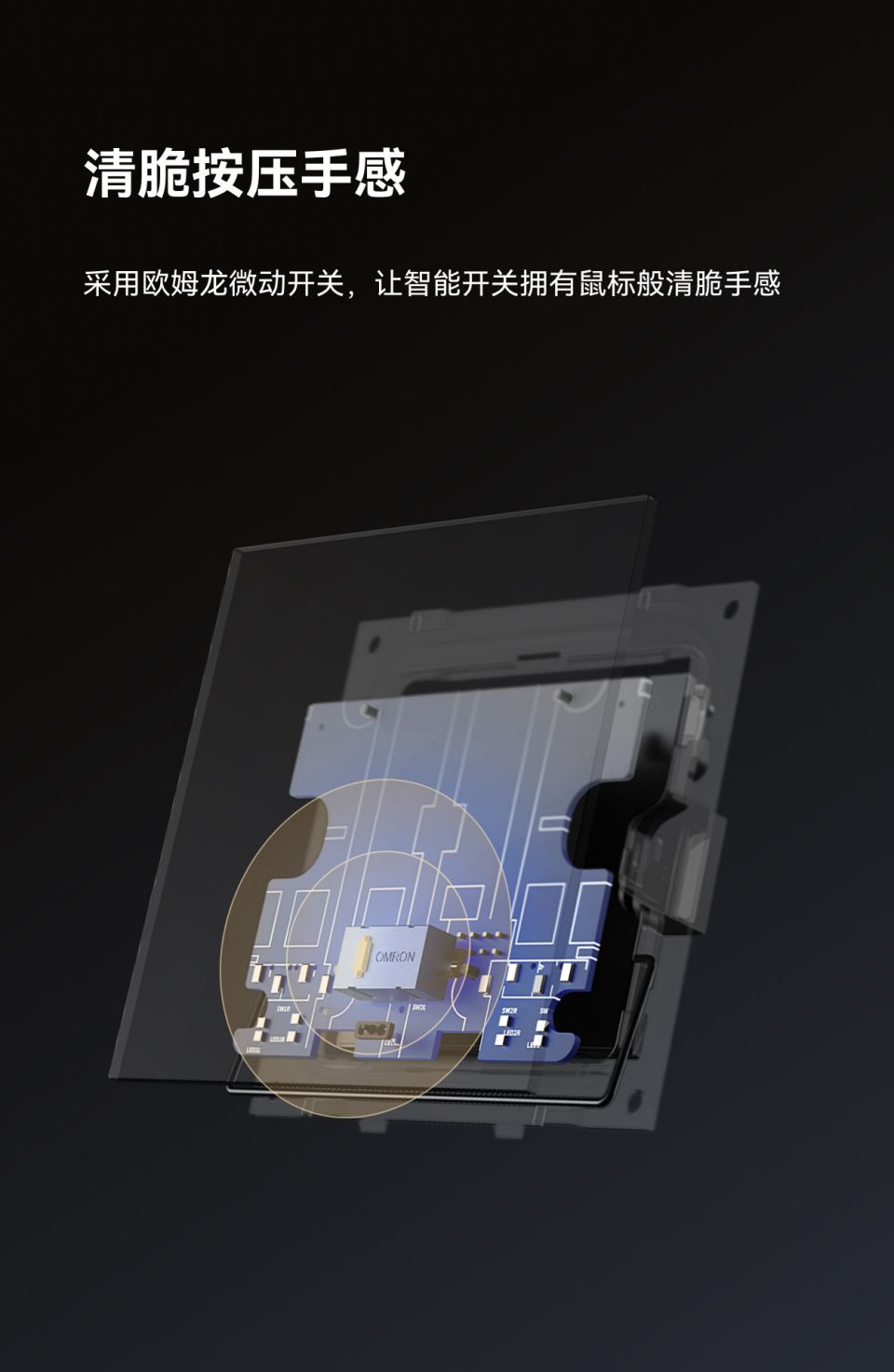 极致简约设计,鼠标极清脆按压手感,继电器/情景模式切换,家族化墙面交互矩阵,供电:零火,每路负载:≤400W,面板材质;PC 手感漆,按键手感:鼠标级微动