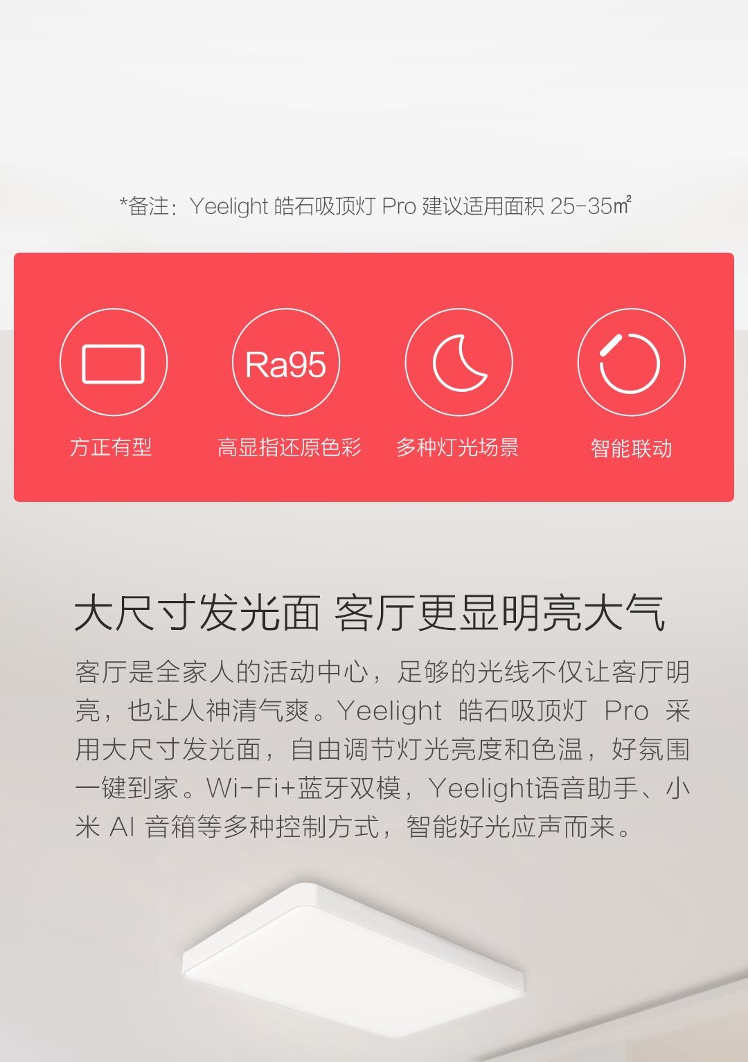 智能语音联动,高显色值,高还原度,可冷暖调节,支持小爱同学控制,支持智能家居场景联动。夜间开月光模式,白天日光模式。