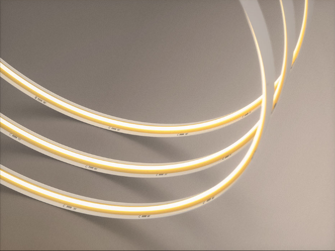 20米无可视亮度差,万分之八超深度调光,高品质照明,双色温COB无颗粒感,功率:6.5W/M,色温:2700-6500K,显指:Ra≥90,光通量:600lm/M,灯珠数量:672颗/M,灯带宽度:10mm