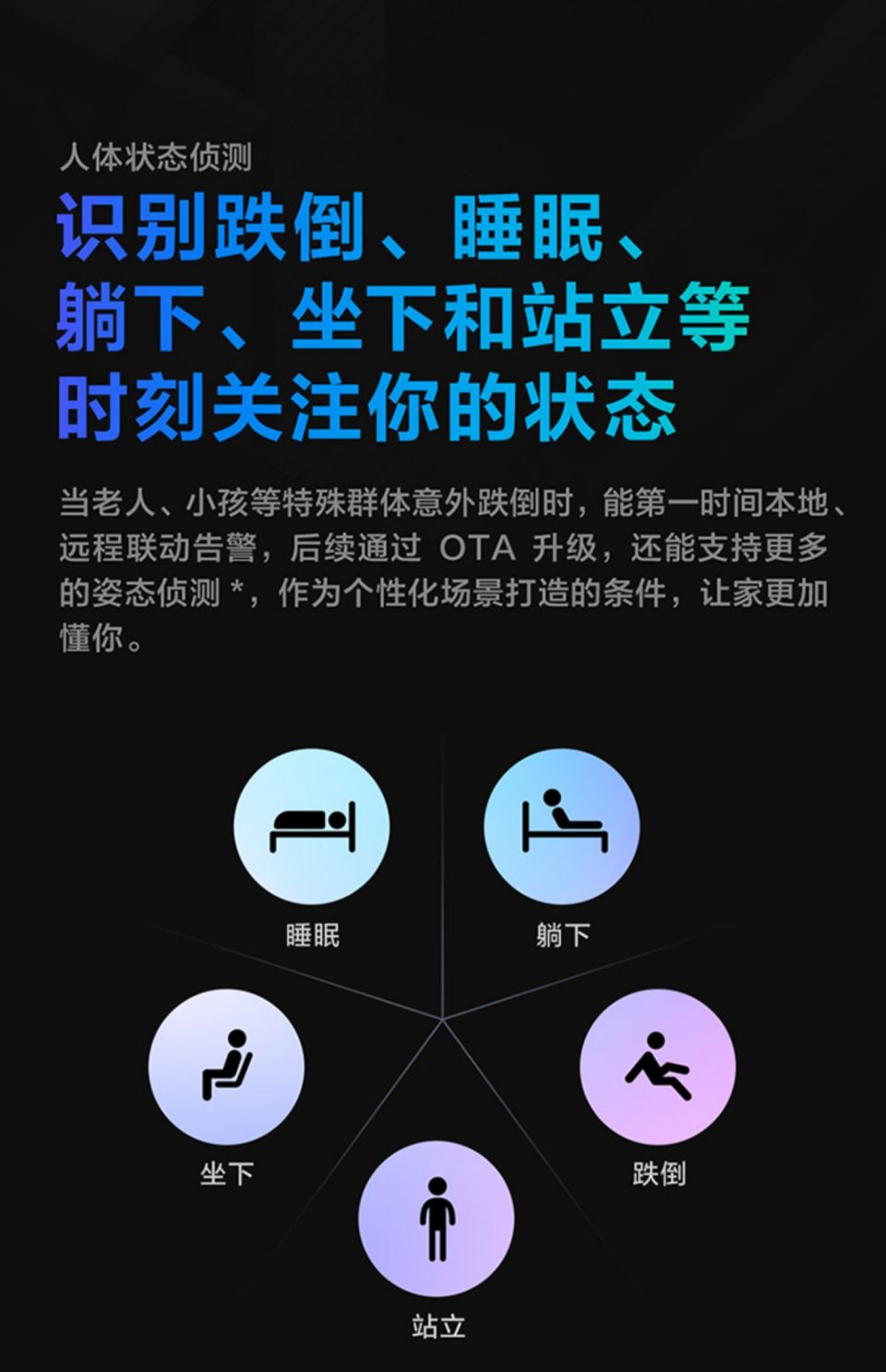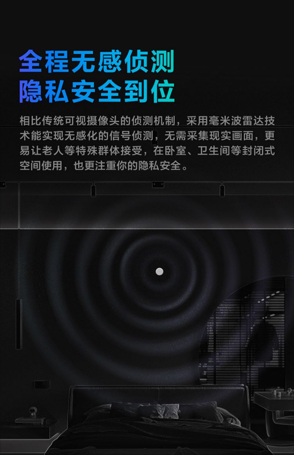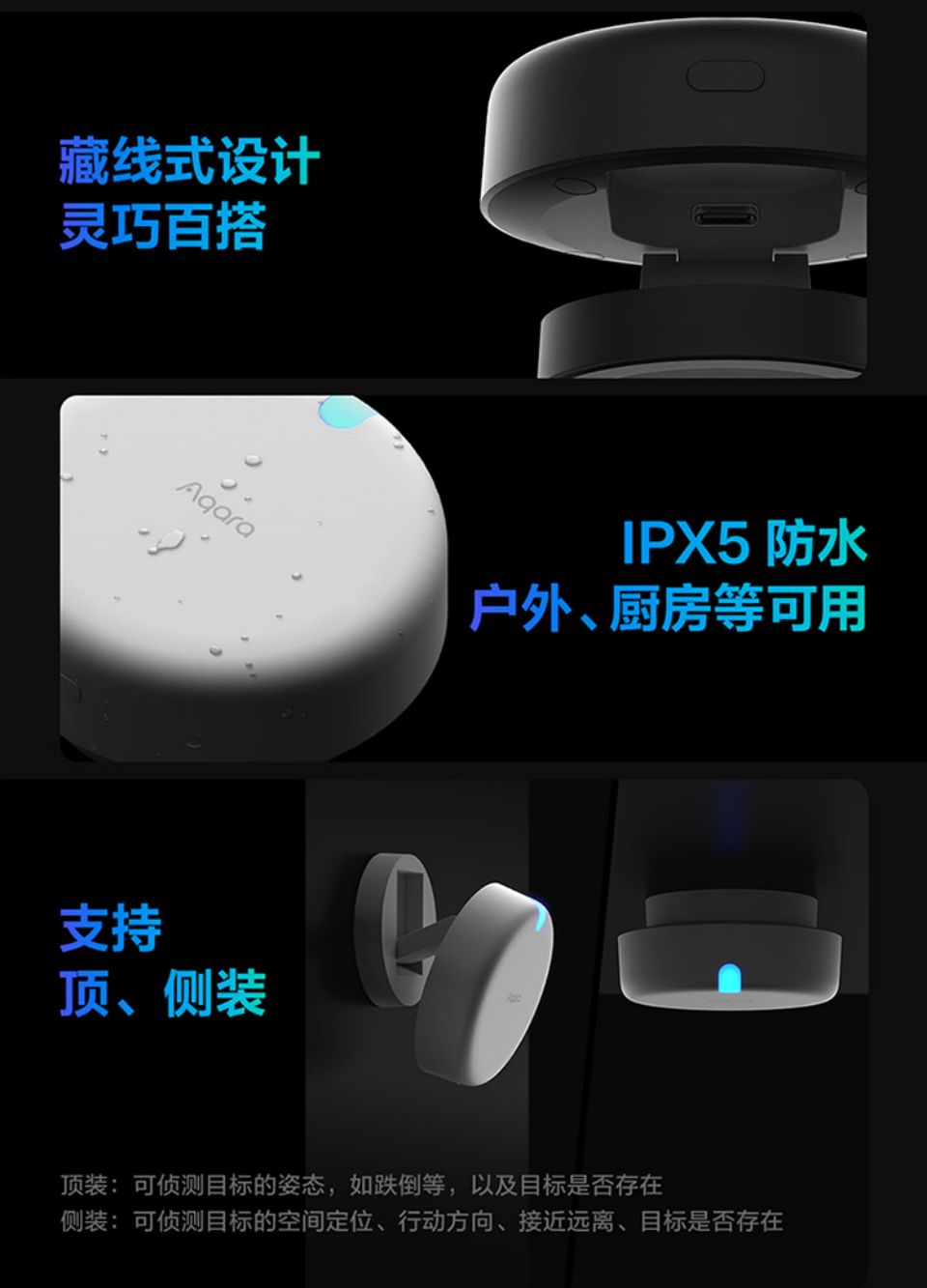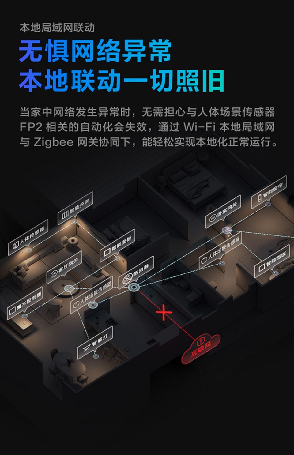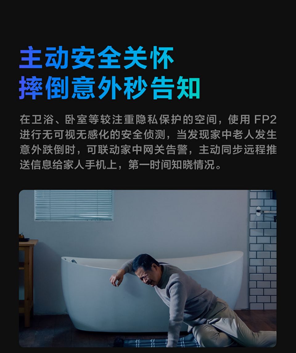 人体场景传感器FP2是一款人体存在、多人区域定位和跌倒侦测产品。可实现大范围人体存在侦测、多目标跟踪、跌倒侦测,支持区域规划、光照感应、Wi-Fi局域网自动化、干扰自动配置等功能;采用Type-C接口并在设备底部出线,适合灵活的隐藏式安装。